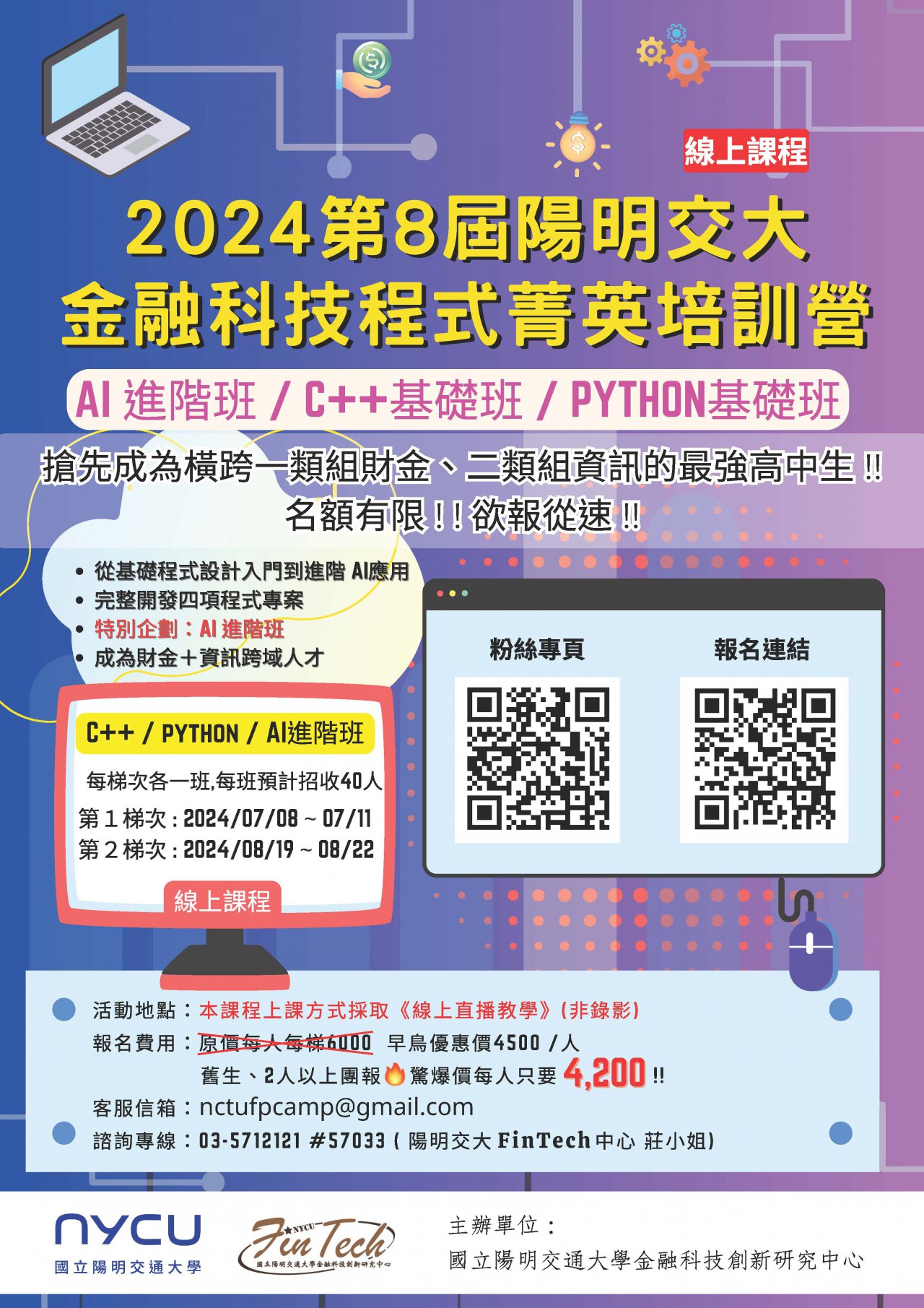 | 一、 | 2024 「第8屆陽明交大金融科技程式菁英培訓營(線上課程)」藉由豐富有趣的課程規劃、深入淺出教學,輕鬆地學習C++、Python之基本概念與實作技巧。今年特別開辦「AI進階班」,名額有限敬請把握! |