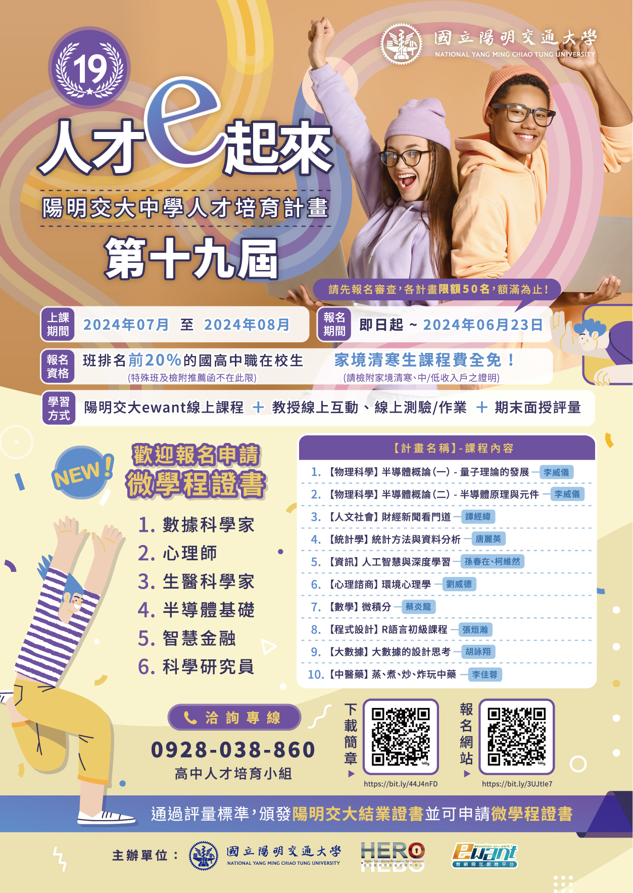 | (四) | 開課日期及報名時間:113年6月至113年8月,請詳閱計畫網站https://ewanths.nycu.edu.tw 各計畫課程說明;計畫採先報名先審查,額滿為止。其報名時間訂於即日起至113年6月23日止。 |