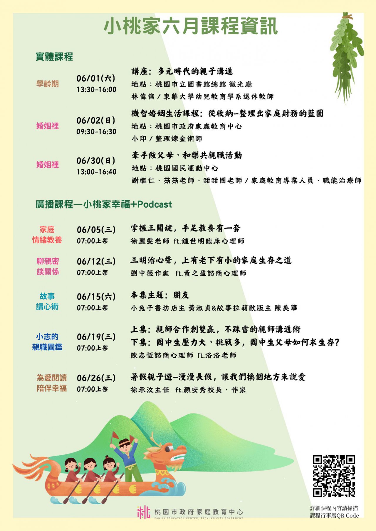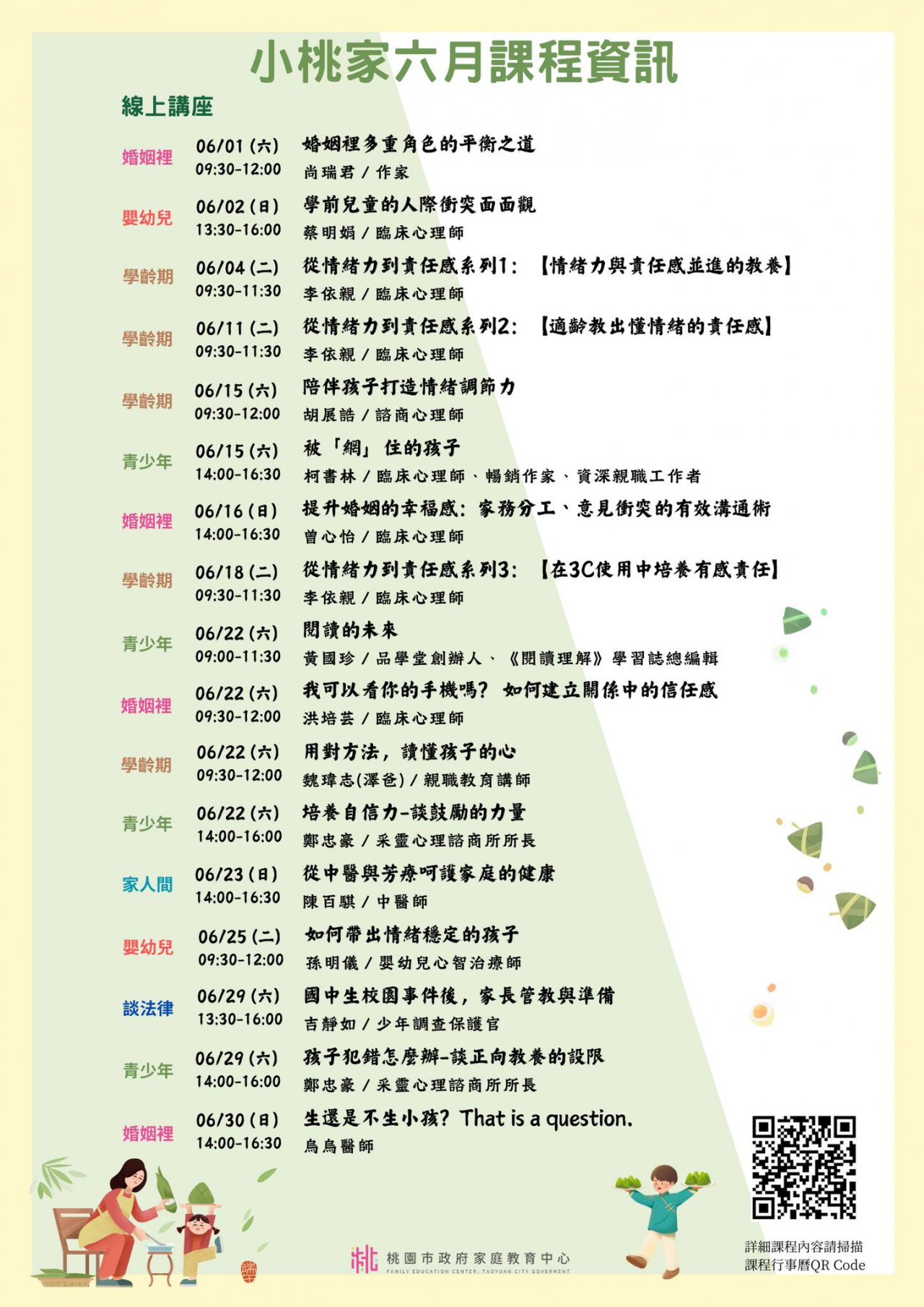 二、旨揭課程詳細資訊,請見中心課程行事曆(https://reurl.cc/xlGyGL)或追蹤「桃園市政府家庭教育中心」FB粉絲專頁;另倘有家庭教育個別化服務需求,可撥打4128185諮詢專線或申請小桃家線上諮詢室(https://reurl.cc/oZWOY5)服務。