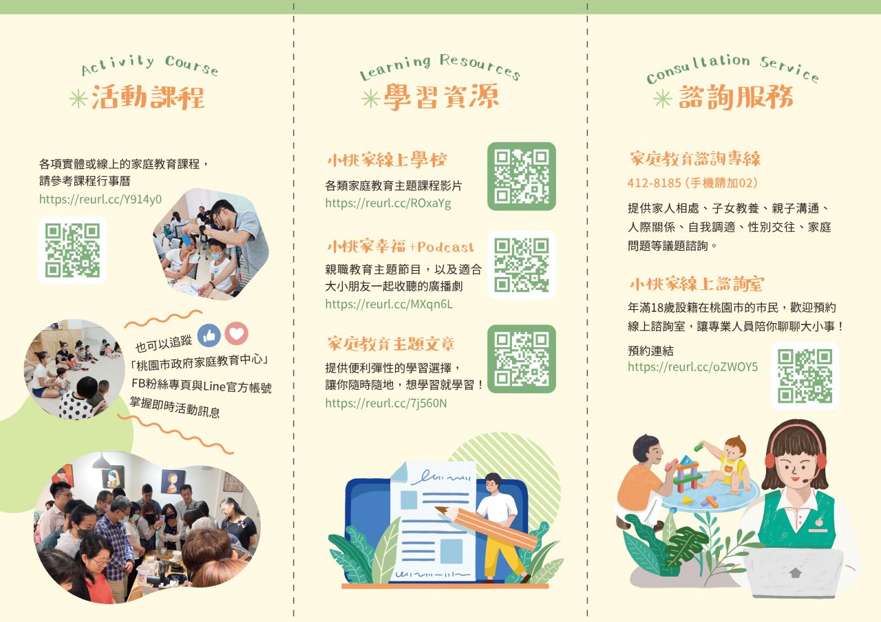 (一) 小桃家線上諮詢室:提供年滿18歲以上之桃園市民每月一次之線上諮詢服務,倘有親職教養、家人關係及家庭資源管理議題,歡迎逕至本中心網站申請及預約(預約連結:https://reurl.cc/oZWOY5)。