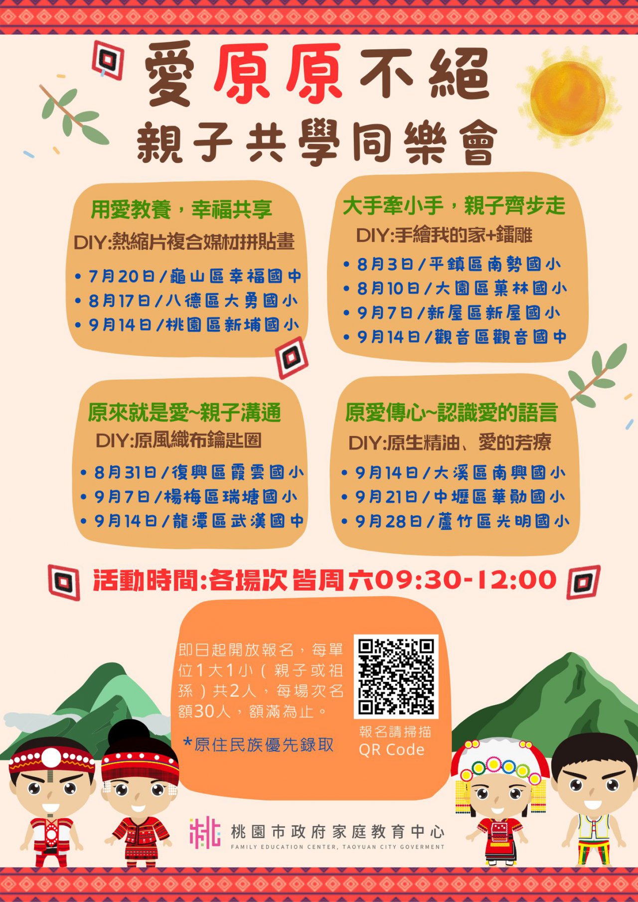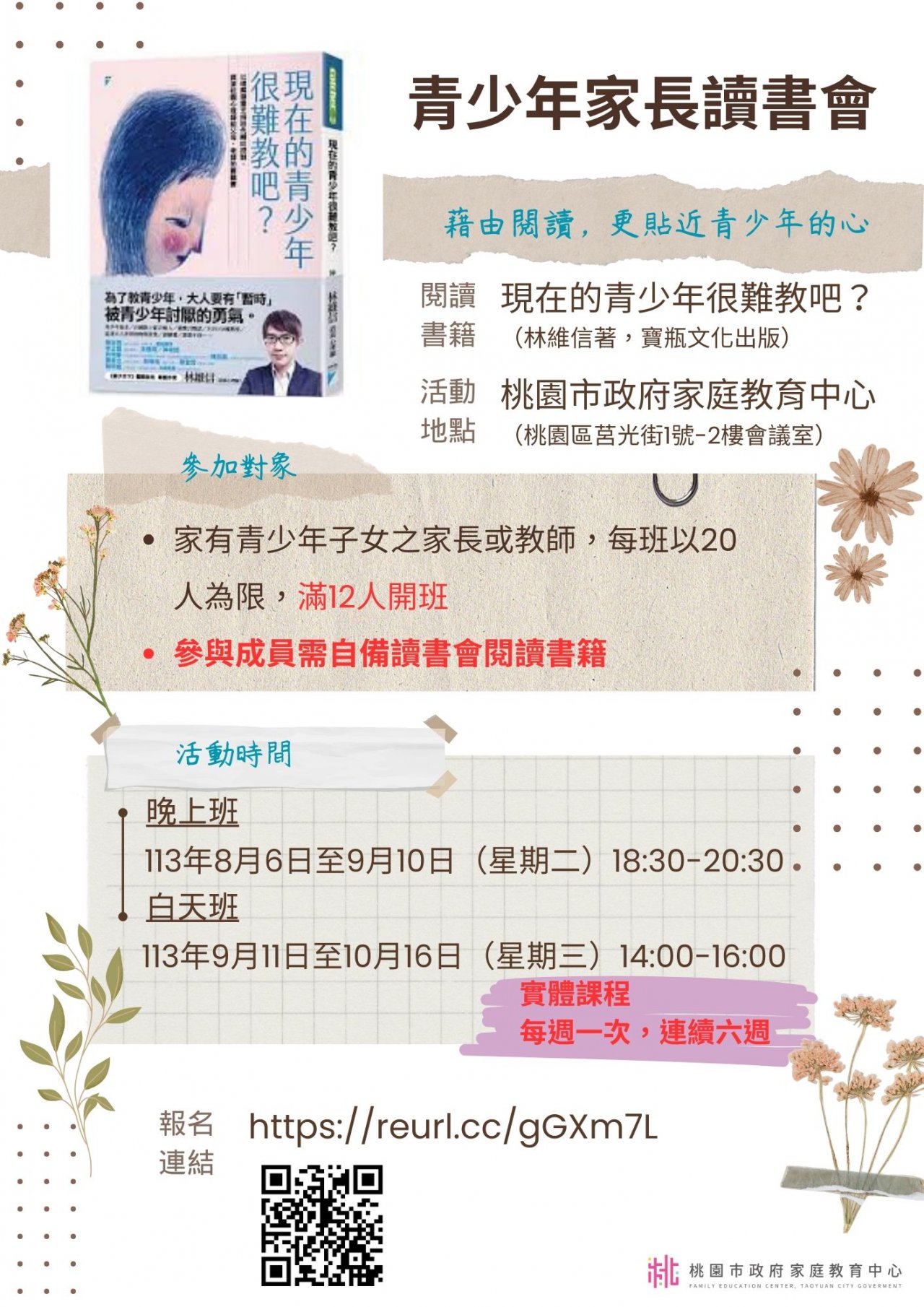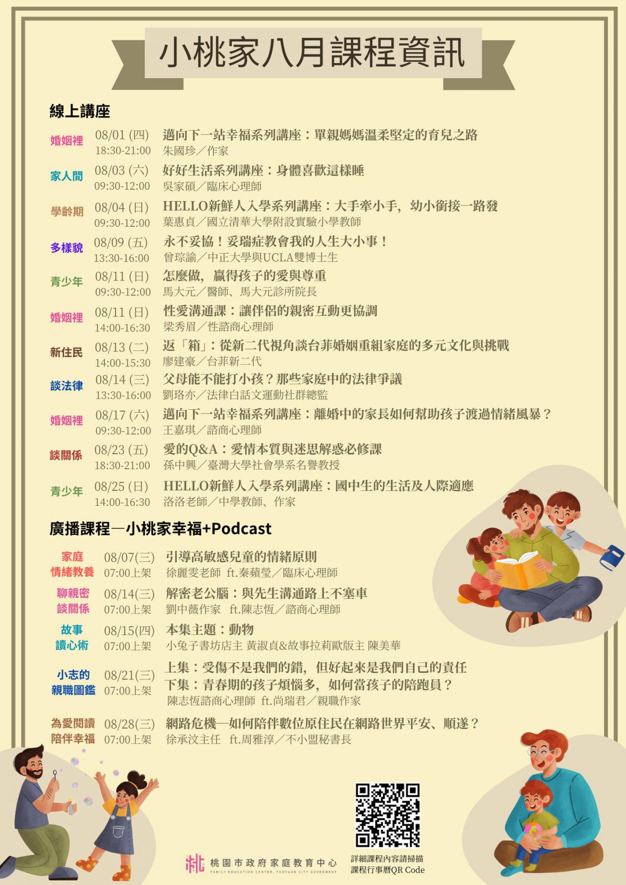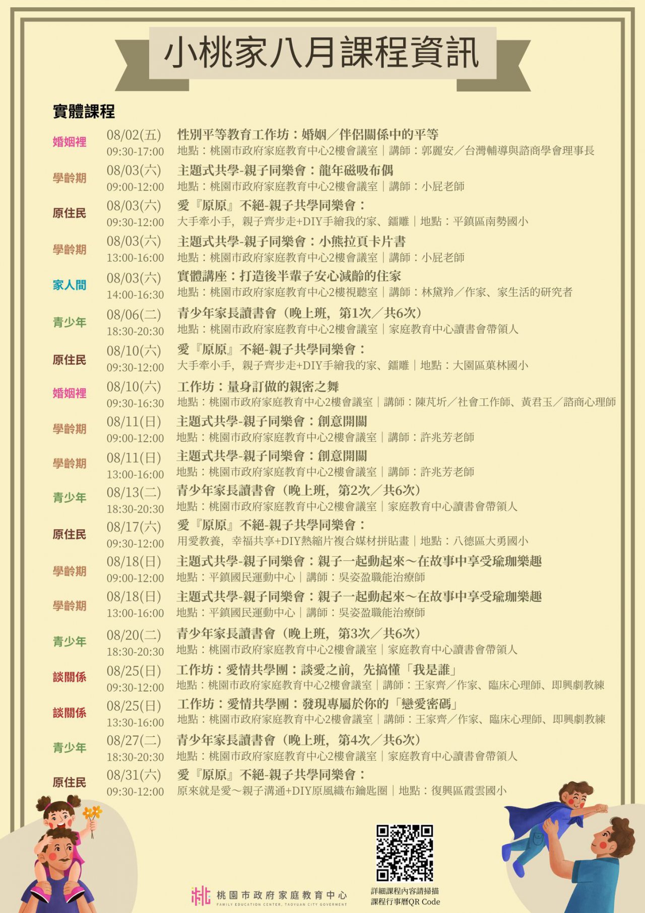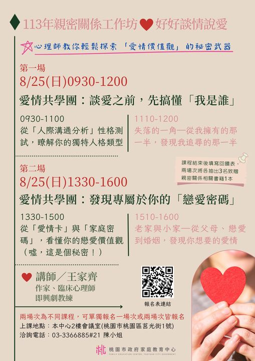 家庭中心辦理之「小桃家8月課程資訊」、「愛原原不絕親子 共學同樂會」、「青少年家長讀書會」、「親密關係工作 坊」及「婚前教育工作坊」如附件。說明: 課程詳細資訊,請見中心課程行事曆 (https://reurl.cc/xlGyGL)或追蹤「桃園市政府家庭教 育中心」FB粉絲專頁;另倘有家庭教育個別化服務需求, 可撥打4128185諮詢專線或申請小桃家線上諮詢室 (https://reurl.cc/oZWOY5)服務。
