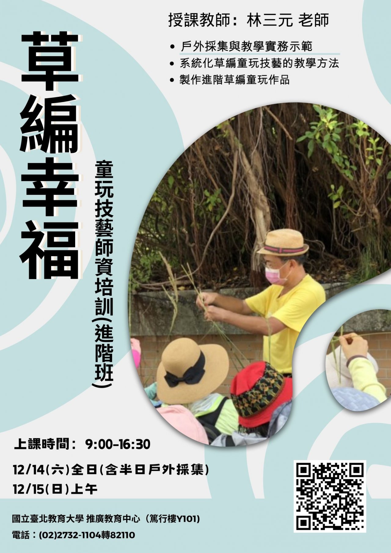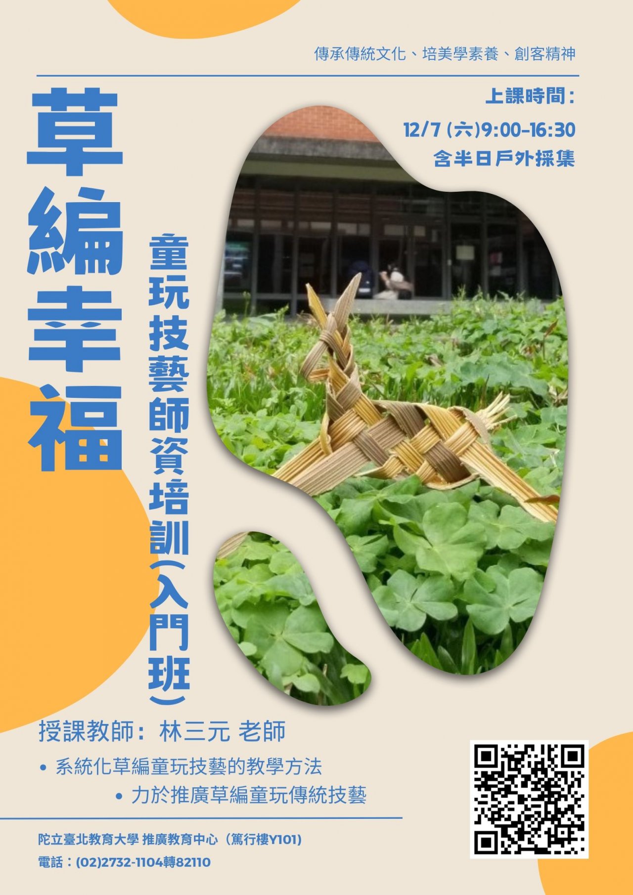 有關國立臺北教育大學推廣教育中心師資培訓暨證照班系列課程「草編幸福-童玩技藝師資培訓(入門班、進階班)、兒童財商初階講師培訓班」招生訊息,請參閱附件。