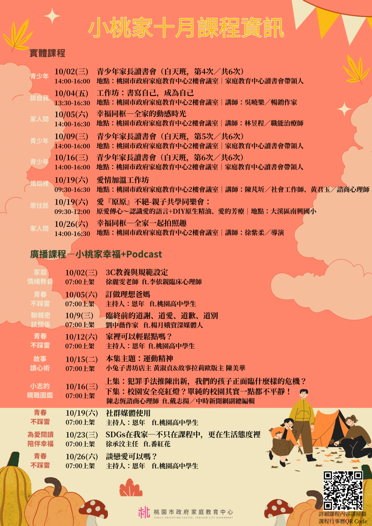 家庭教育中心10月份推廣教育活動~~歡迎有興趣之家長老師們報名參加