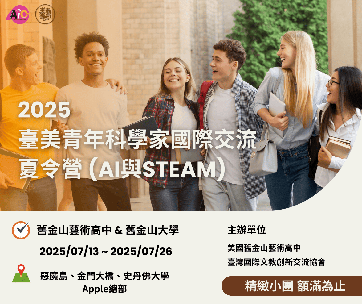 | 二、 | 本夏令營將於明(2025)年7月13日(日)至7月26日(六)舉辦,由本會帶團前往美國舊金山進行國際交流,參與以ESL英文、AI程式設計與STEAM科學主題之課程,亦安排參訪我國駐舊金山辦事處、史丹佛大學、舊金山大學,造訪矽谷及舊金山著名景點,並與美國舊金山藝術高中學生交流,完成夏令營活動之學生可獲頒舊金山藝術高中結訓證書。 |