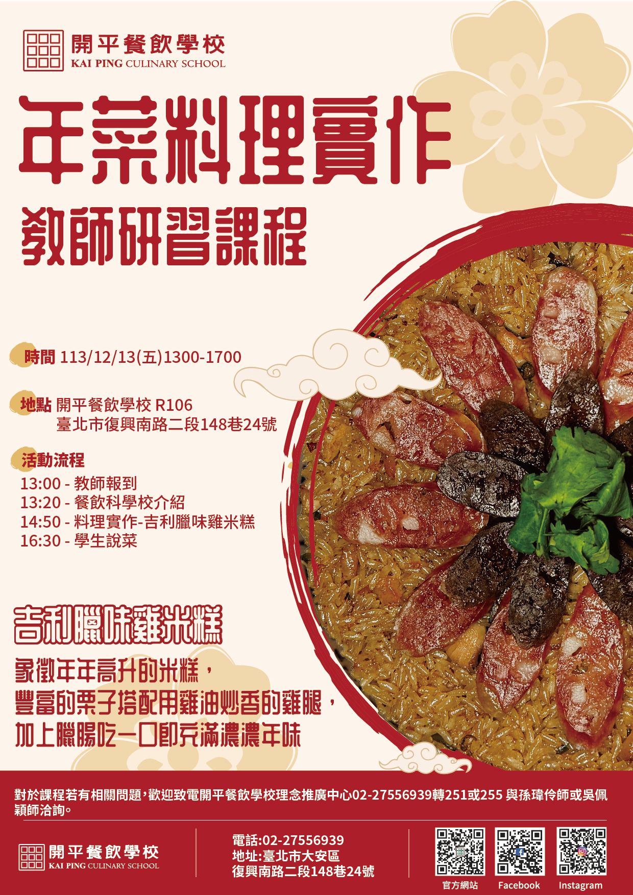 四、報名方式:採線上報名,請上”全國教師在職進修資訊 網”報名,課程名稱:創意年菜教師研習,課程代碼: 4775177。報名截止日期:113年12月11日(三),課程名 單將於開課前二天確認遴選名單。