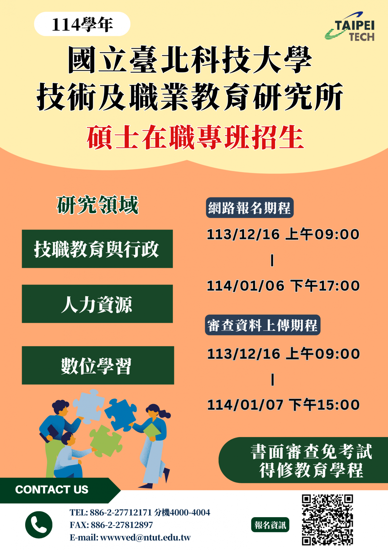 轉知-國立臺北科技大學技術及職業教育研究所114學年度碩士在職專班招生