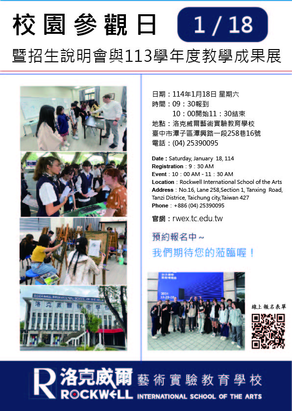 三、校園參觀日詳細訊息如下: (一)時間:114年1月18日(星期六)上午10:00-12:00 (二)參加對象:認同本校教育理念之國中學生與家長
