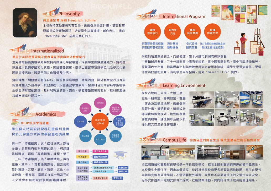 二、本校為「學校型態」實驗高中,秉持席勒審美教育哲學, 透過個別學習計畫及藝術設計導向實驗教育模式,營造雙 語的住宿學習環境,勾勒出美力、品格力及國際移動力的 學生圖像。