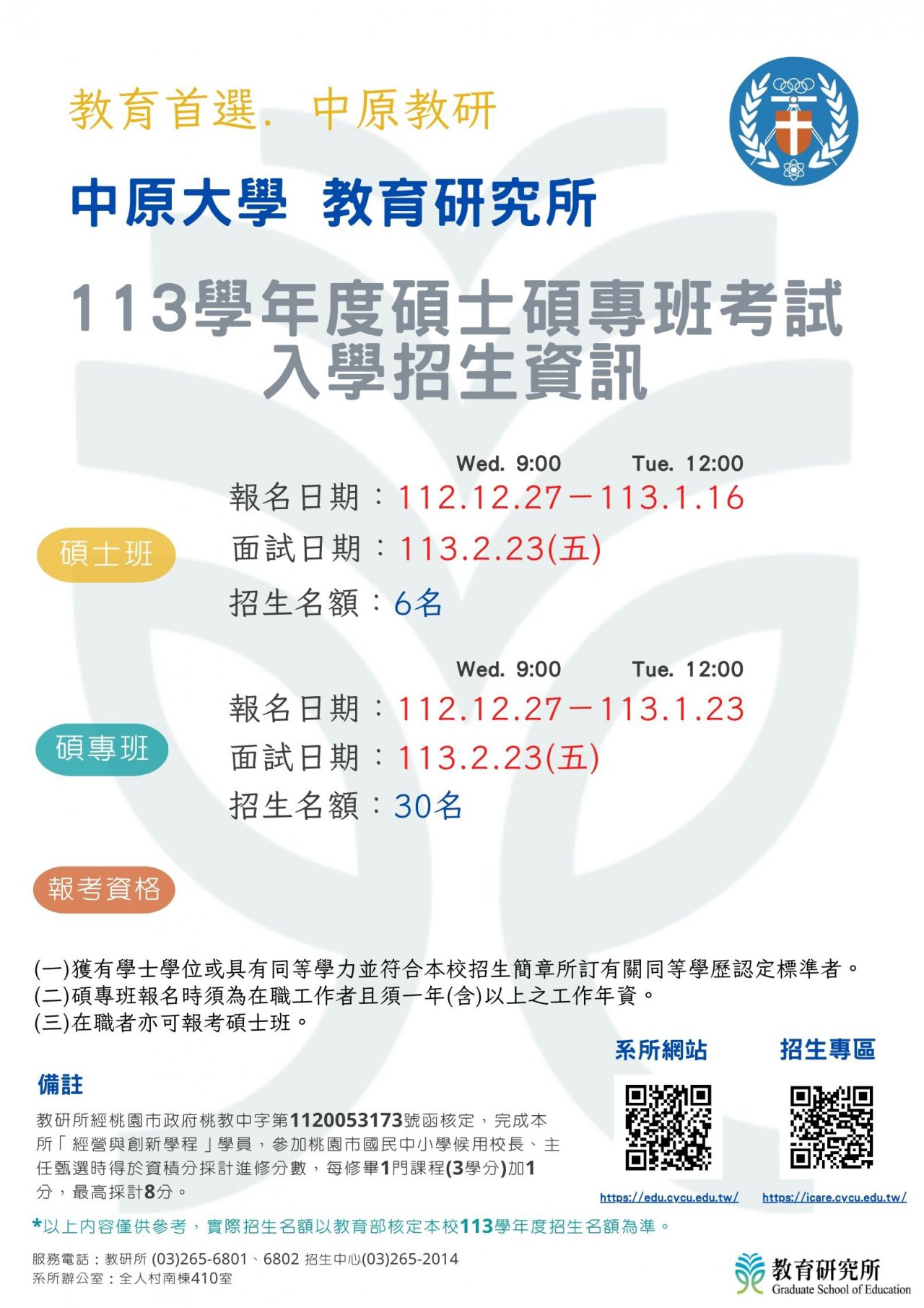 有關中原大學113學年度教育研究所招生訊息,請參閱附件。