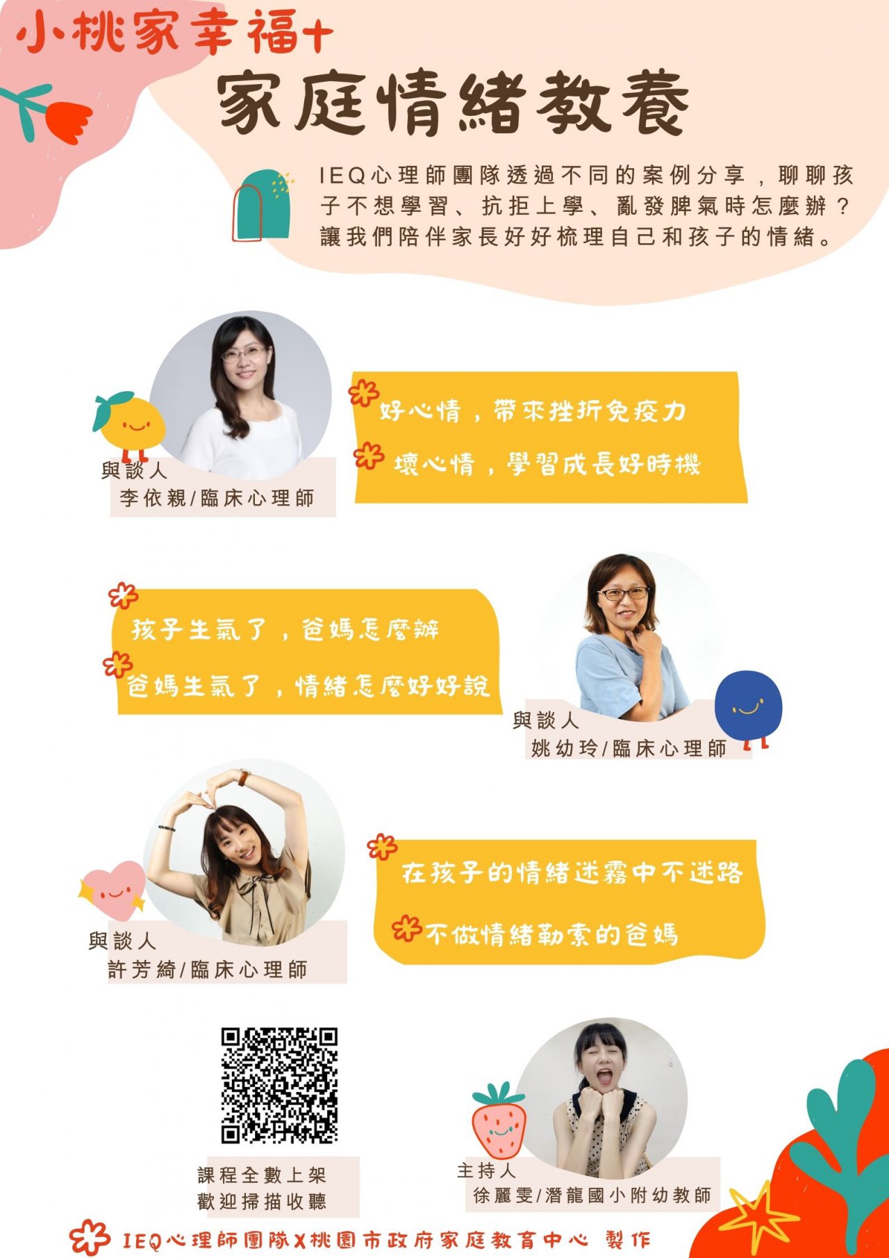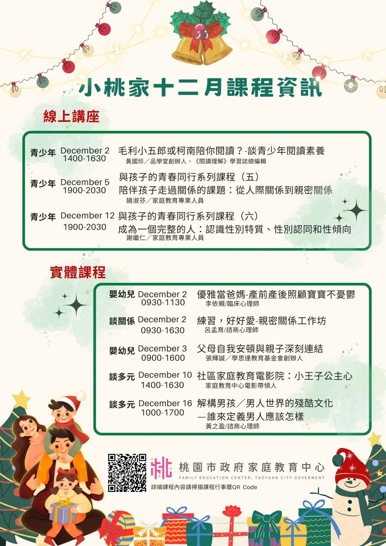 二、旨揭課程詳細資訊,請見中心課程行事曆(https://reurl.cc/xlGyGL)或追蹤「桃園市政府家庭教育中心」FB粉絲專頁;另倘有家庭教育個別化服務需求,可撥打4128185諮詢專線或申請小桃家線上諮詢室(https://reurl.cc/oZWOY5)服務。