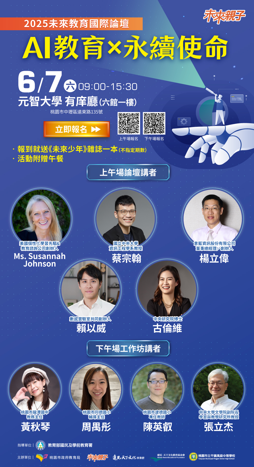 | 二、 | 為讓教師了解如何培育學生成為具備AI素養、永續意識的世界公民與全球競爭力的未來人才,特舉辦「2025未來教育國際論壇」,期望藉由此論壇的舉辦,分享桃園在智慧教育領域的推動成果與願景,開啟更多關於未來教育願景與實踐路徑的對話,攜手打造更智慧、更永續的教育生態系,展現桃園作為智慧教育標竿城市的決心與實踐。 |