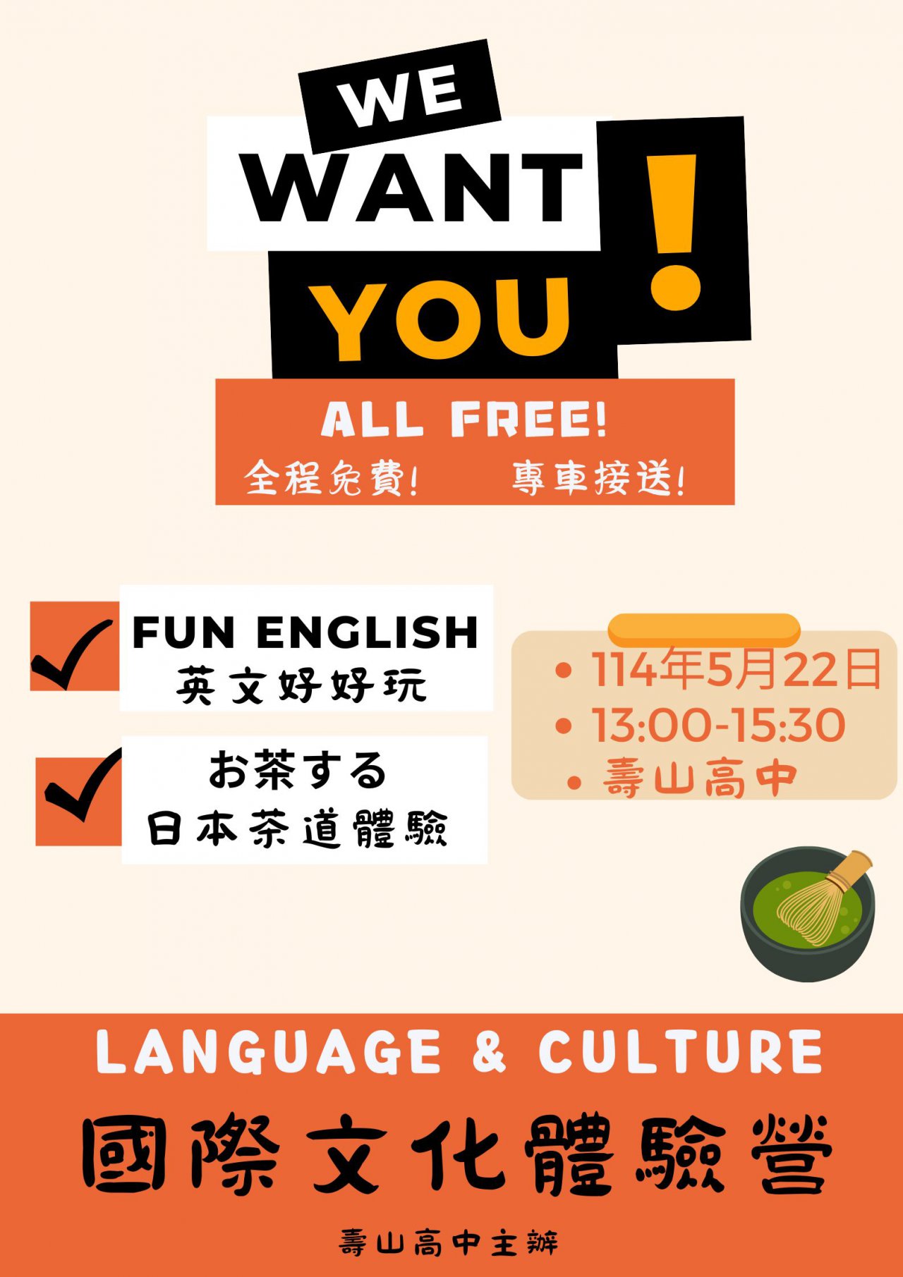 一、為實踐本校國際視野之願景,特辦旨揭活動提供國中階段學 生體驗本校國際文化課程,內容包含趣味英文及日本茶