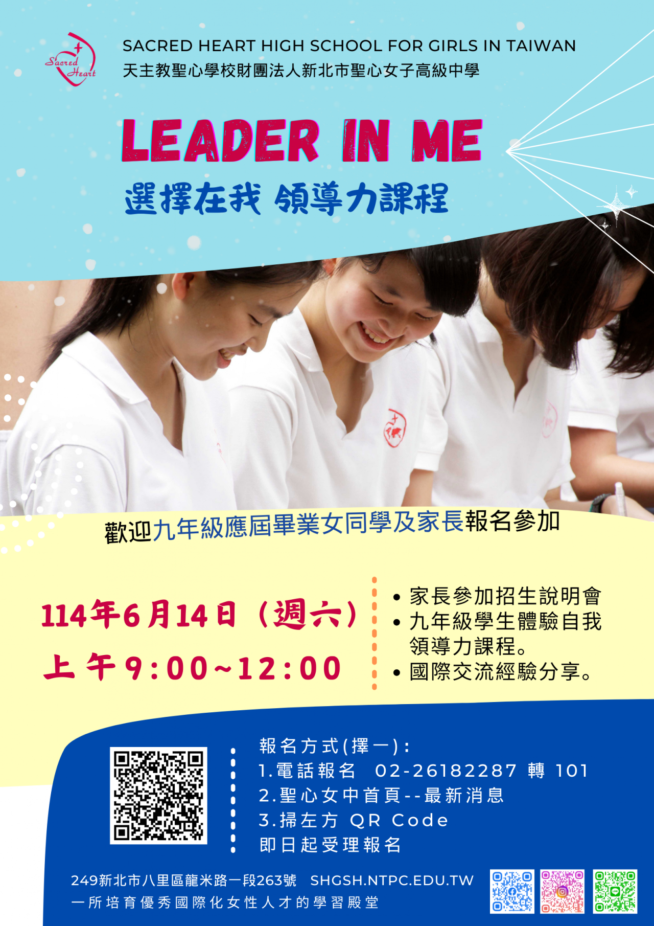 三、報名方式: (一) 報名表連結:https://forms.gle/6xHtKqbBq3RRShT7A (二) 或至聖心女中首頁http://www.shgsh.ntpc.edu.tw—最新消息 報名。