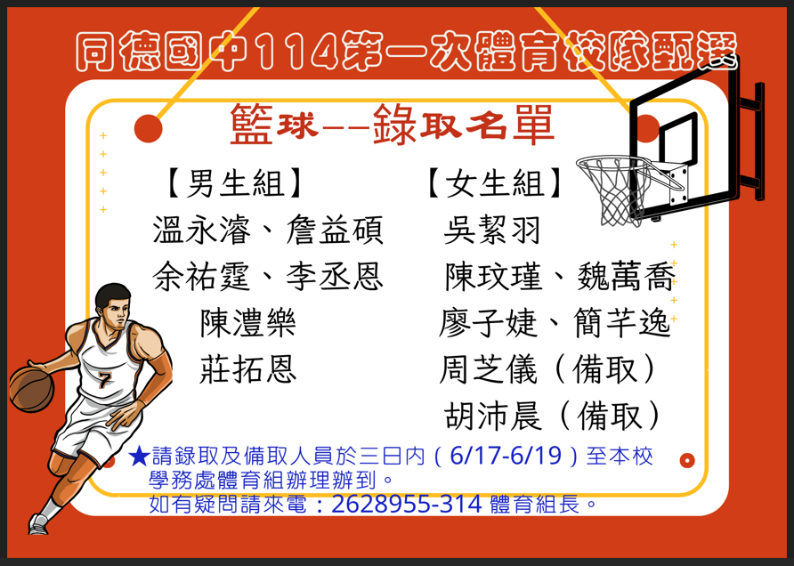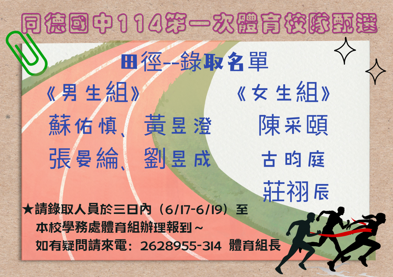 ★請錄取人員於6/17-6/19至本校學務處體育組辦理報到手續~