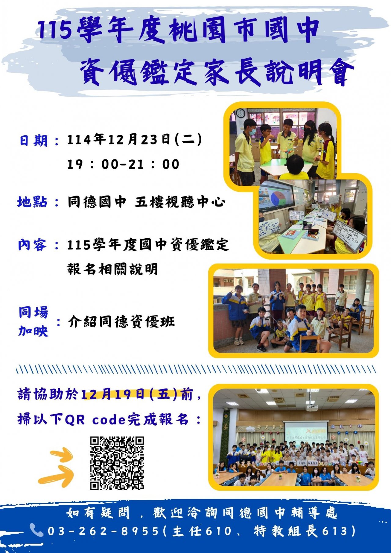 一、 為使家長充分了解入學前資優鑑定時程及重要事項,以及本校資優教育的課程規劃及環境,特舉辦此說明會。