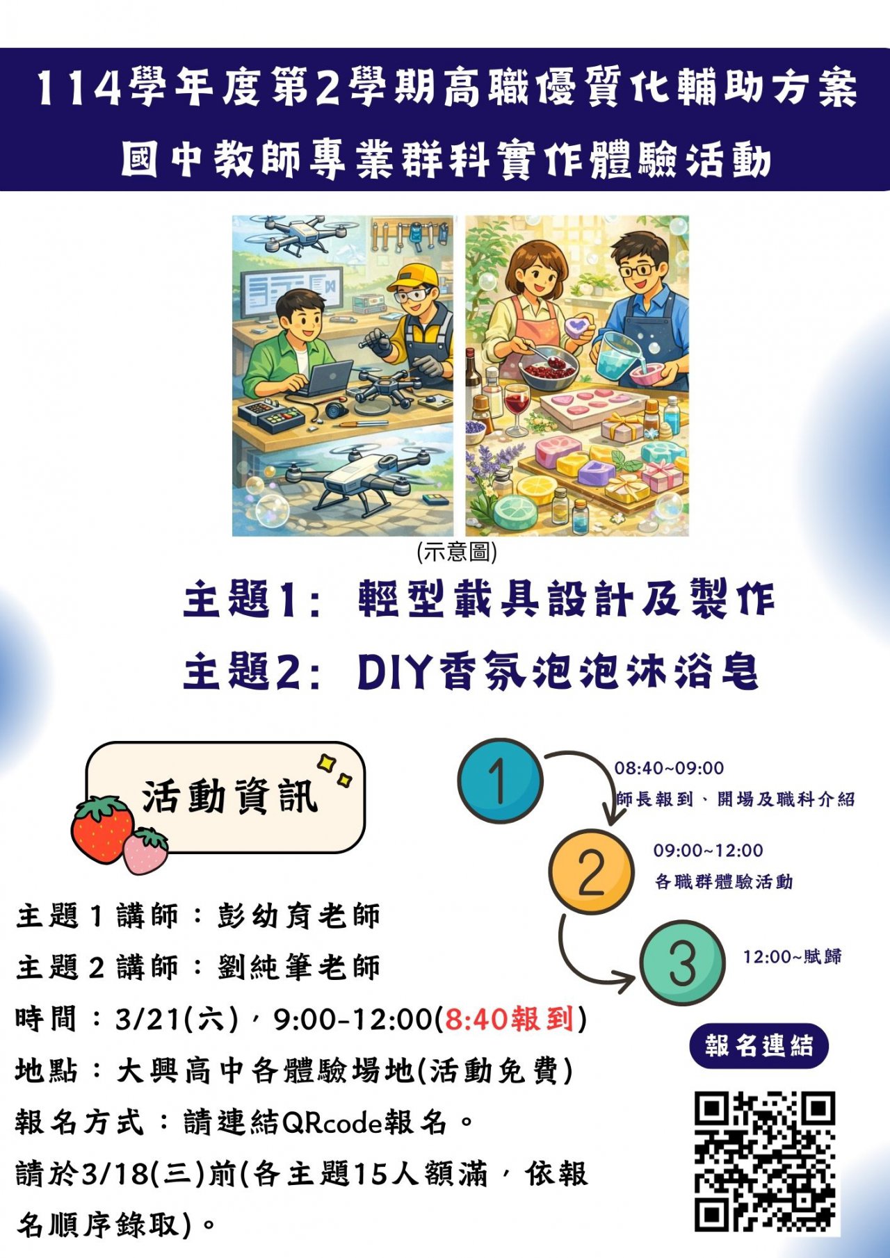 | 七、 | 活動內容: 動力機械群-主題:輕型載具設計及製作。 家政群-主題:DIY香氛泡泡沐浴皂。 |