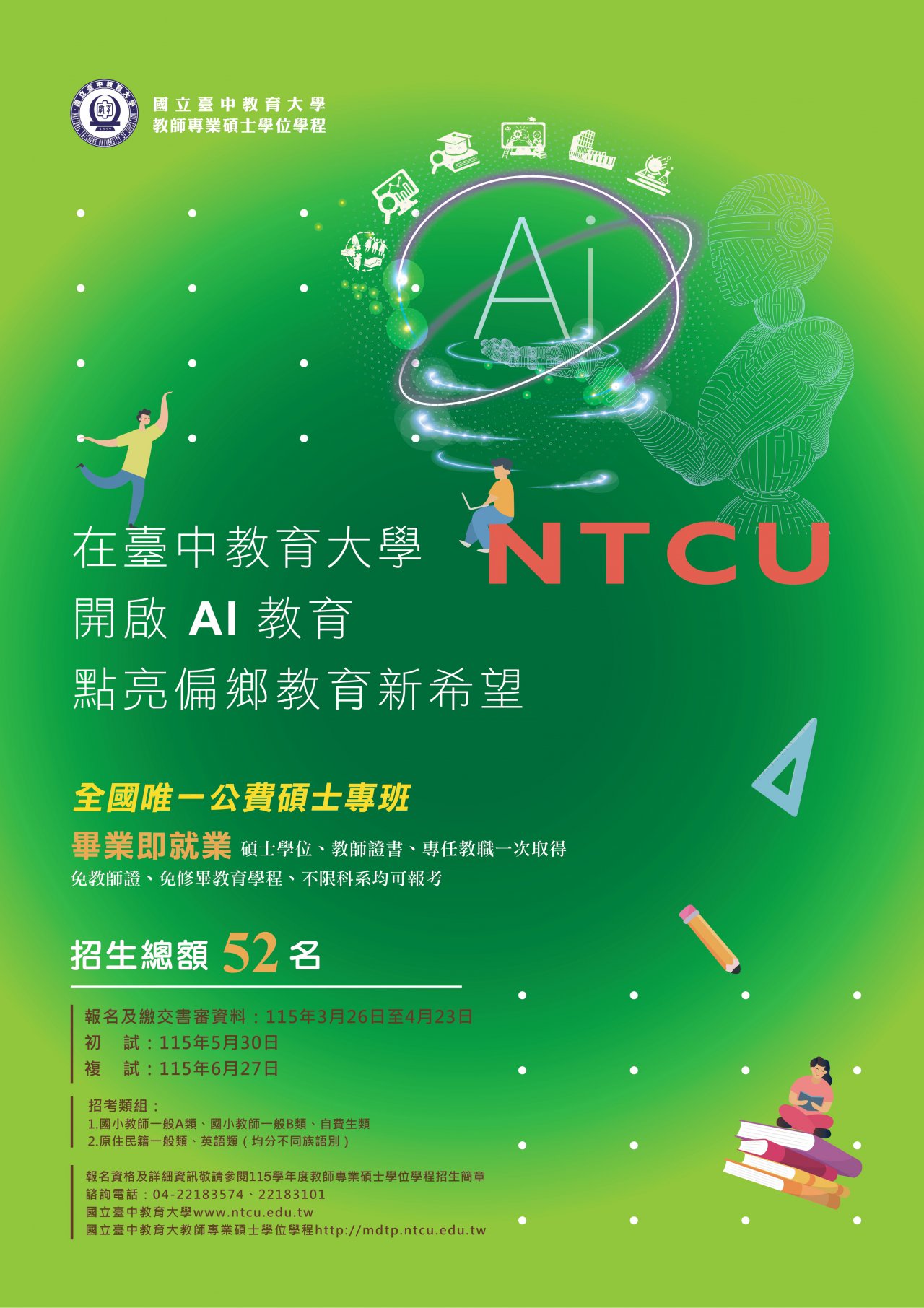 | 二、 | 115學年度招生考試自115年3月26日至4月23日報名(含繳交書審資料),5月30日初試,6月27日複試,招生簡章請參閱本校招生資訊網(https://as.ntcu.edu.tw/)。 |