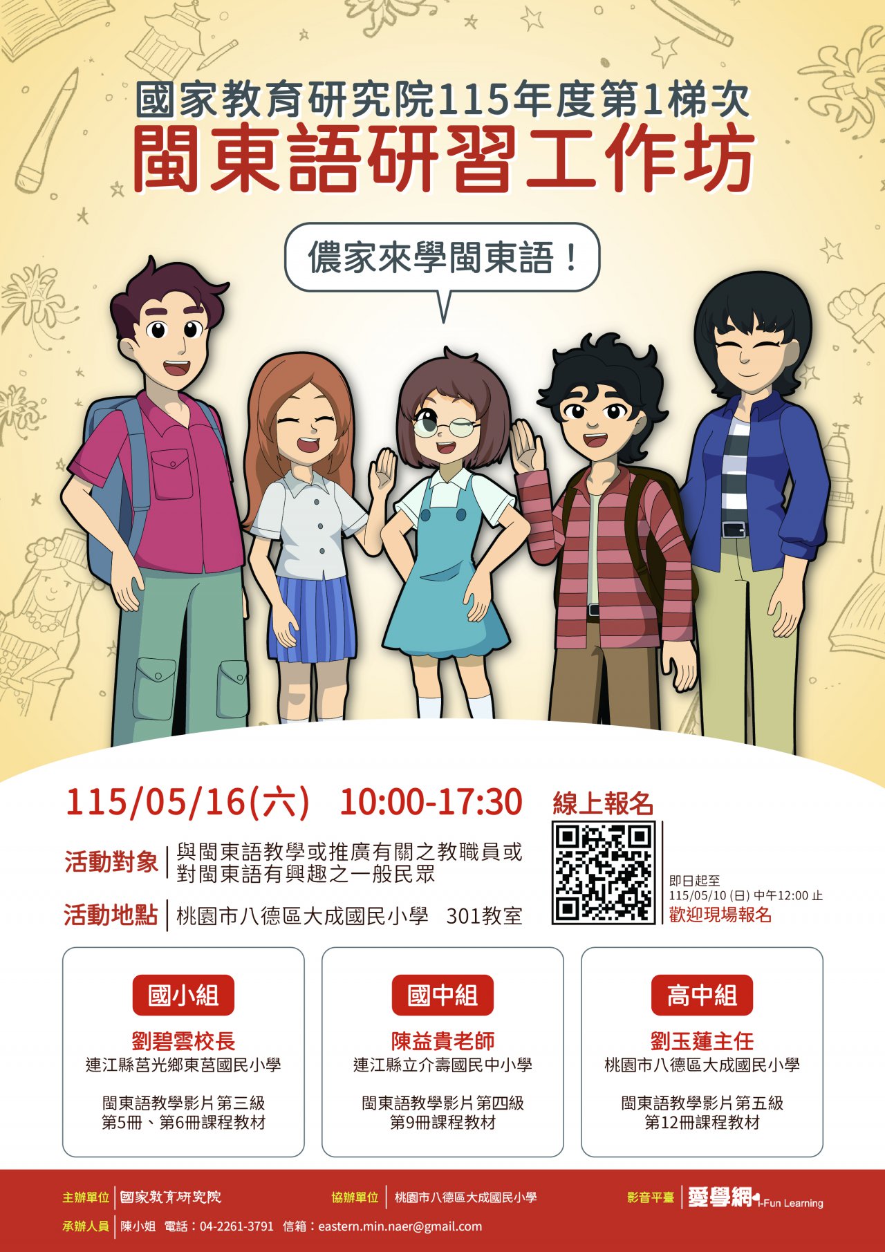 | 二、 | 為推動國家語言發展法,執行國家語言整體發展方案,國教院114年完成12支閩東語教學媒體影片製作;為推廣教學媒體影片,擴大使用效益,特別規劃辦理115年第1梯次「閩東語研習工作坊」活動,期透過教學經驗與實務分享,達到提升閩東語教學效益與運用範疇之目標。 |