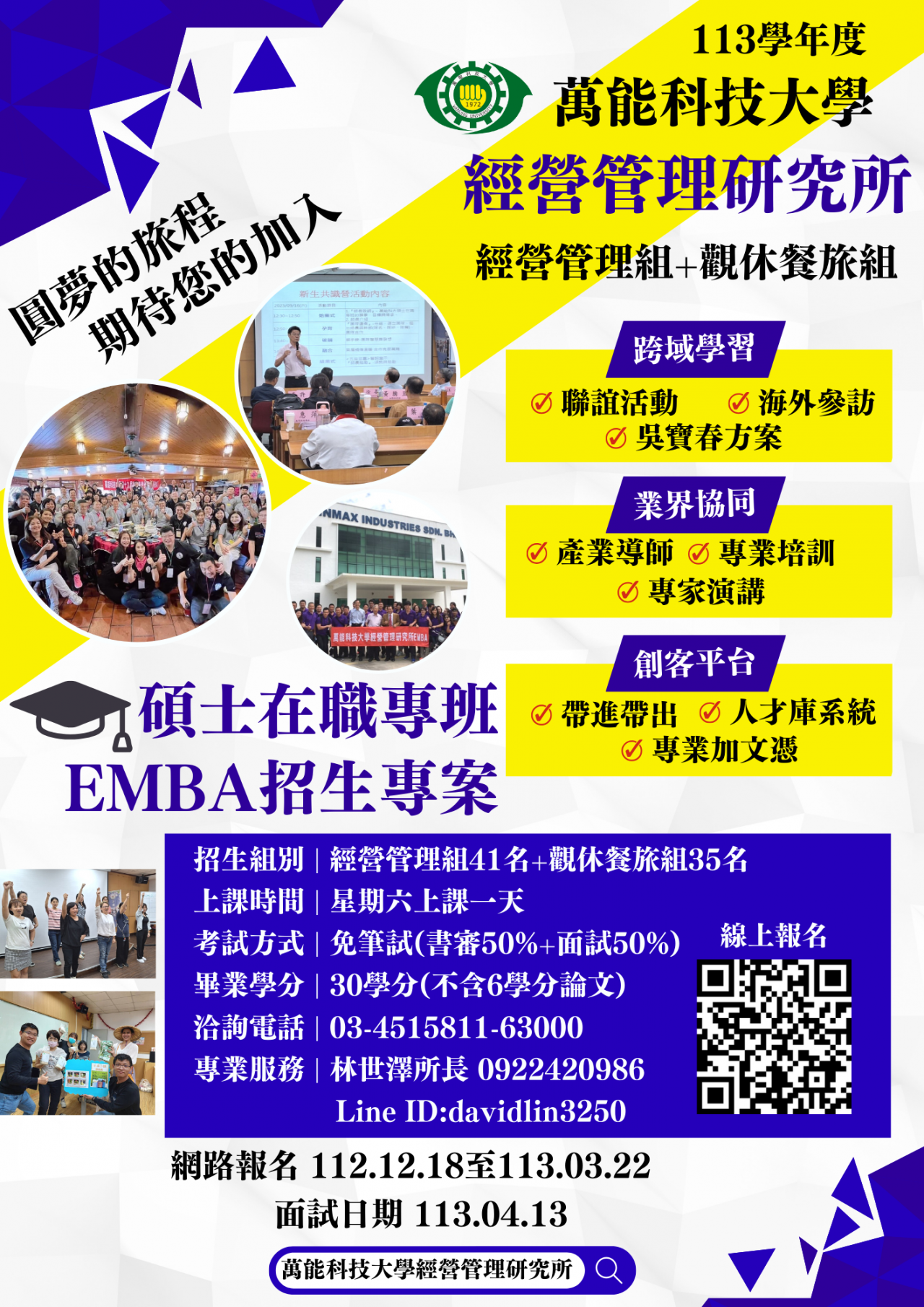 轉知-萬能科技大學113學年度經營管理研究所碩士在職專班招生資訊