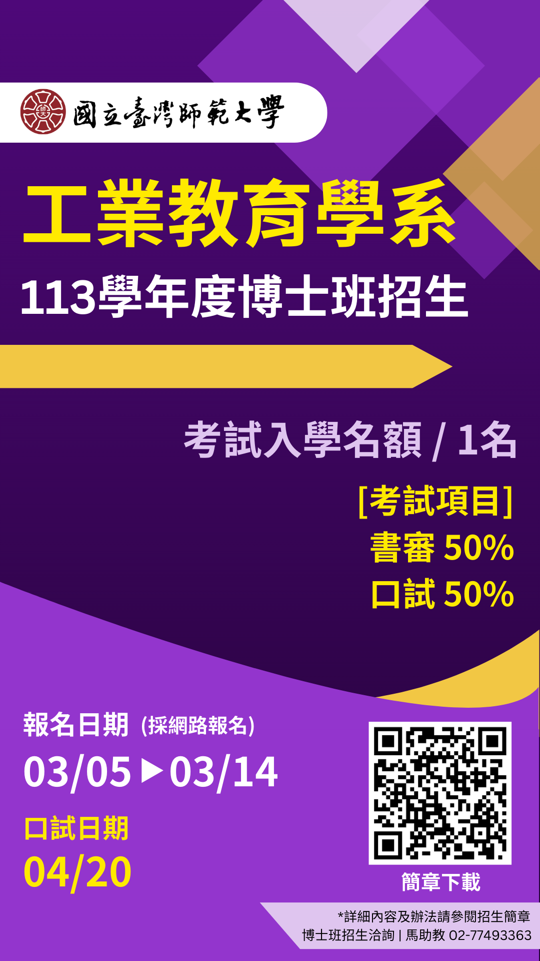 轉知-國立臺灣師範大學工業教育學系「113學年度博士班考試入學」招生