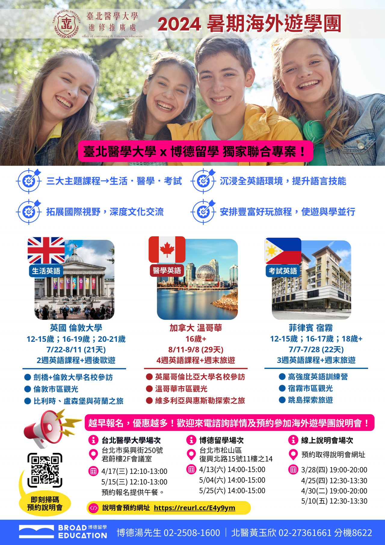| 二、 | 本校舉辦海外遊學團已邁入第 23 期且不限北醫學生參加,今年舉辦三團,簡要資訊如下: |