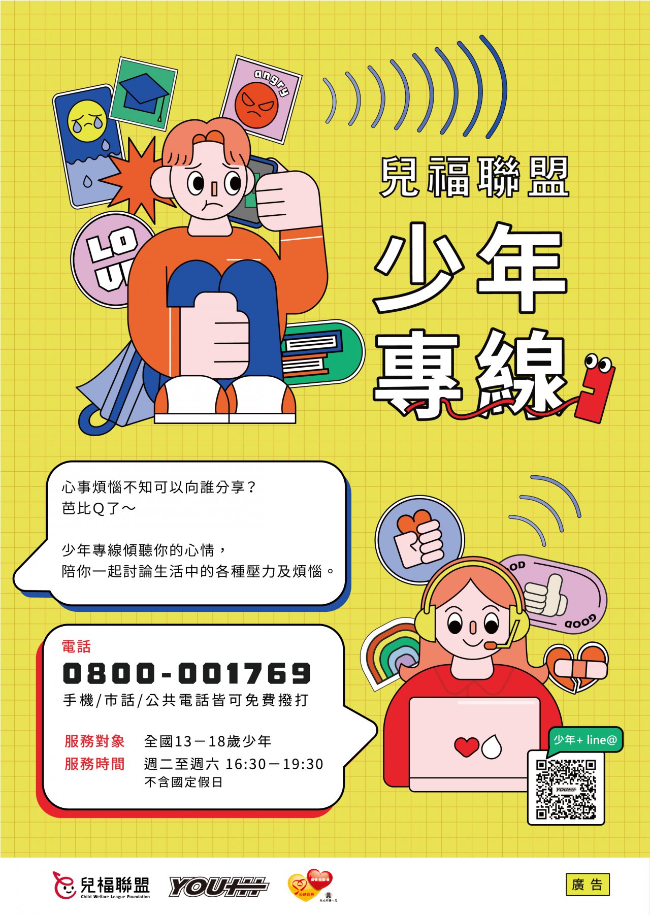 一、 本會辦理「兒福聯盟-少年專線服務(0800-001769)」,提供全台12歲至18歲之少年免付費電話諮詢服務,服務時間為每週二至週六下午4:30至7:30。期待透過此專線傾聽少年的需求,協助其抒發壓力,並引導、陪伴他們面對和解決困難。