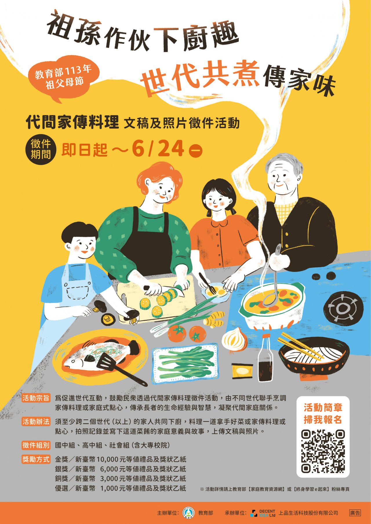 三、旨揭活動徵件對象分為:國中組、高中組及社會組(含大專院校),參賽者須與不同世代之家人共同下廚料理一道拿手菜或家庭點心,拍照記錄互動過程,並書寫這道菜餚的家庭意義與故事,將文稿與照片上傳即完成投件。徵件期程自113年5月8日(星期三)起至113年6月24日(星期一)止。活動內容請洽詢承辦單位:上品生活科技股份有限公司呂小姐(電話:02-2501-2336#112、電子郵件:angel@letzcreate.com)及駱小姐(電話:02-2501-2336 #116、電子郵件:ruby1201@letzcreate.com),或詳教育部【終身學習e起來】粉絲專頁或徵件活動網頁-獎金獵人平臺(https://bhuntr.com/tw/competitions/8m0njd81uerxi5h3tr)。